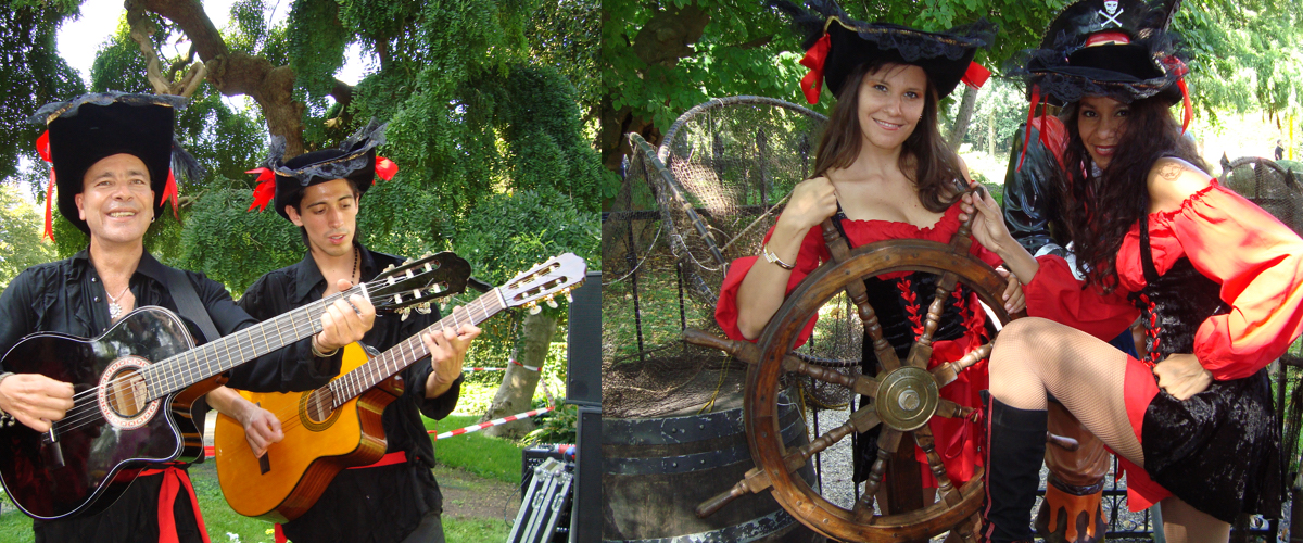 Ze krijgen een lekkere piraten cocktail van 2 mooie dames. Een dame zingt met haar papagaai (op een goede dag zingt de papagaai ook mee).De piraten mengen zich onder de gasten en doen alsof ze iets zoeken. Ze gaan rond met props en maken foto’s met de gasten! Muzikanten spelen rondlopend gezellige akoestische muziek!